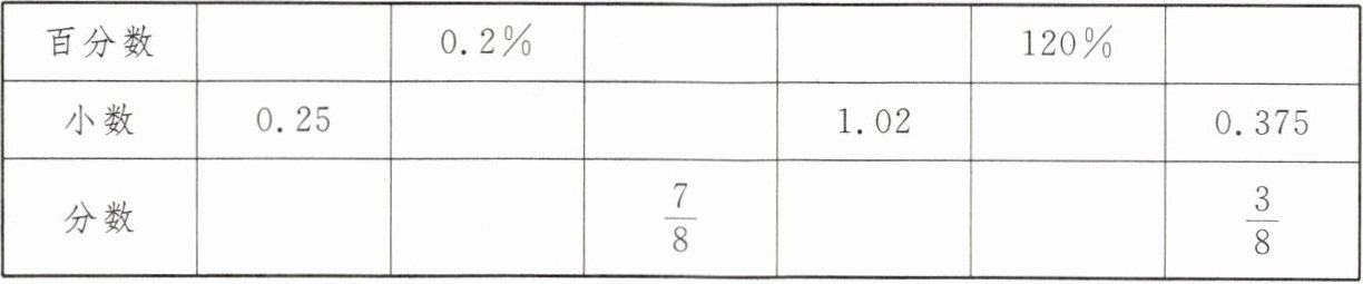 (按横排顺序)25% 87.5% 102% 37.5% 0.002 0.875 1.2 $\frac{1}{4}$ $\frac{1}{500}$ $\frac{51}{50}$ $\frac{6}{5}$