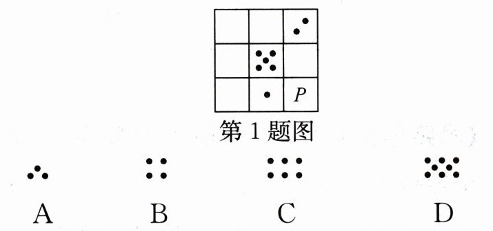 1. 我国古代的“河图”问题:由 $ 3×3 $ 的方格构成,每个方格内均有数目不同的点图,每一行、每一列以及每一条对角线上的三个点图的点数之和均相等. 图中给出了“河图”的部分点图,请你推算出 $ P $ 处所对应的点图是(