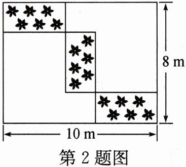 2. 在长为 $ 10 m $、宽为 $ 8 m $ 的矩形空地中,沿平行于矩形各边的方向分割出三个全等的小矩形花圃,其示意图如图所示,则小矩形花圃的长和宽分别为(