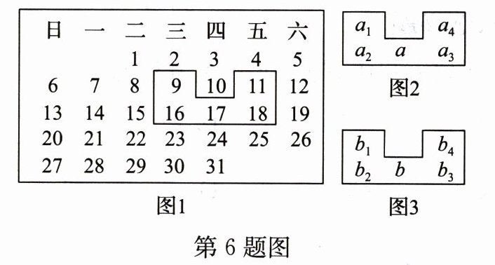 6. 如图1是某年某月的月历,用如图2所示的“凹”型在月历中任意圈出5个数,设“凹”型框中的五个数分别为 $ a_1,a_2,a,a_3,a_4 $.