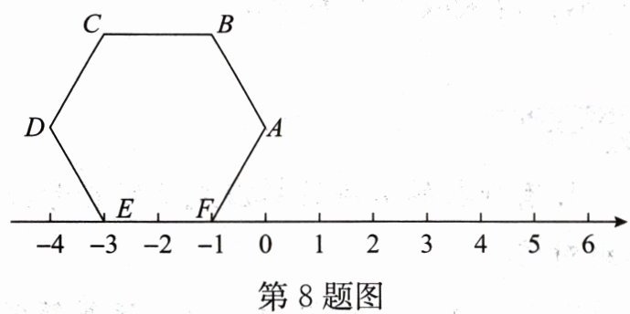 8. 正六边形 ABCDEF(每条边长相等、每个角相等)如图放置,点 E,F 在数轴上,它们表示的数分别为 -3,-1. 现将正六边形 ABCDEF 按顺时针方向在数轴上连续翻转,翻转 1 次后,点 A 落在数轴上且表示的数为 1,像这样连续翻转 2025 次后,落在数轴上的是什么点?