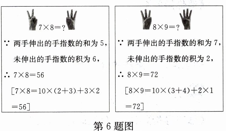 6. 法国的“小九九”从“一一得一”到“五五二十五”和我国的“小九九”是一样的,后面就改用手势了。如图所示为使用法国“小九九”计算$7×8和8×9$的两个示例。若用法国的“小九九”计算$7×9$,左、右手依次伸出手指的个数是(