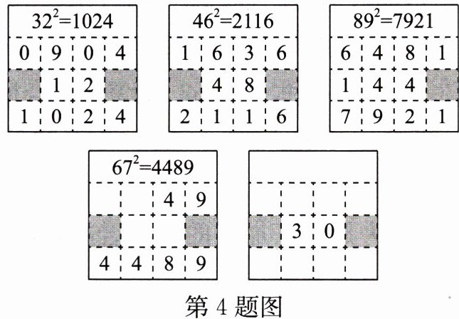 4. 求两位数的平方时,可以用“列竖式”的方法进行速算,求解过程如图所示,则第$5$个框中最下面一行的四位数可能是(