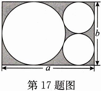 17. 中国剪纸是一种用剪刀或刻刀在纸上剪刻花纹,用于装点生活或配合其他民俗活动的民间艺术.在校园文化艺术节的剪纸展示中,小华在一张长为$a$、宽为$b$的长方形纸片上,剪掉一个大圆和两个半径相等的小圆(如图).列出表示剩余纸片(图中阴影部分)面积的代数式.