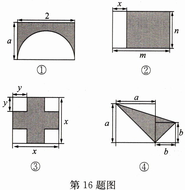 综上,图①阴影面积$2a-\frac{1}{2}\pi$;图②阴影面积$(m - x)n$;图③阴影面积$x^{2}-4y^{2}$;图④阴影面积$\frac{1}{2}a^{2}+\frac{1}{2}b^{2}-\frac{1}{2}ab$。