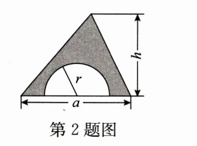 2. 如图,在一个底边长为 $ a $,高为 $ h $ 的三角形铁皮上剪去一个半径为 $ r $ 的半圆.当 $ a = 8 $,$ h = 6 $,$ r = 3 $ 时,剩下铁皮(阴影部分)的面积为 ($ \pi $ 取 $ 3.14 $)。