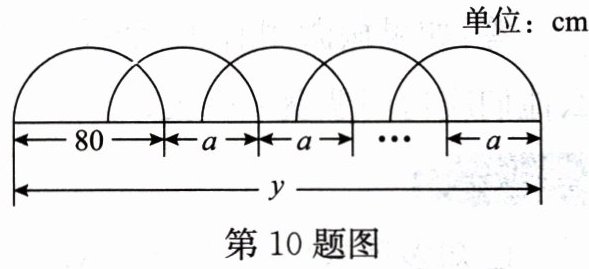 10. 如图,某花园的护栏是用一些半圆形钢条围成的,半圆的直径为80 cm,且每增加1根半圆形钢条,护栏的长度就增加$a$ cm($a > 0$).设半圆形钢条的总根数为$x$($x$为正整数),护栏的总长度为$y$ cm.