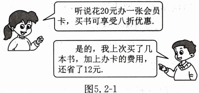 例3 如图5.2-1,小颖和小明相约到图书大厦去买书,请你根据他们的对话内容,求出小明上次所买书籍的原价。