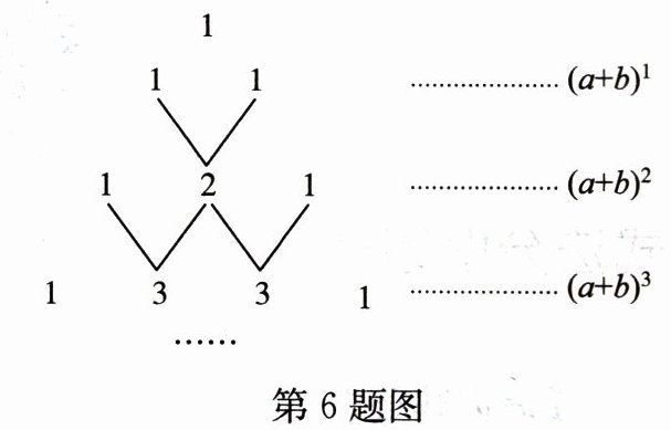 6. 我国古代数学的许多发现都曾位居世界前列,其中“杨辉三角”就是一例. 如图,这个三角形的构造法则如下:两腰上的数都是$1$,其余每个数均为其上方左右两数之和,它给出了$(a + b)^{n}$($n$为正整数)的展开式(按$a$的次数由大到小的顺序排列)的系数规律. 例如,三角形中第三行的三个数$1$,$2$,$1$,恰好对应$(a + b)^{2}= a^{2}+2ab + b^{2}$展开式中的系数;第四行的四个数$1$,$3$,$3$,$1$,恰好对应$(a + b)^{3}= a^{3}+3a^{2}b + 3ab^{2}+b^{3}$展开式中的系数;等等.