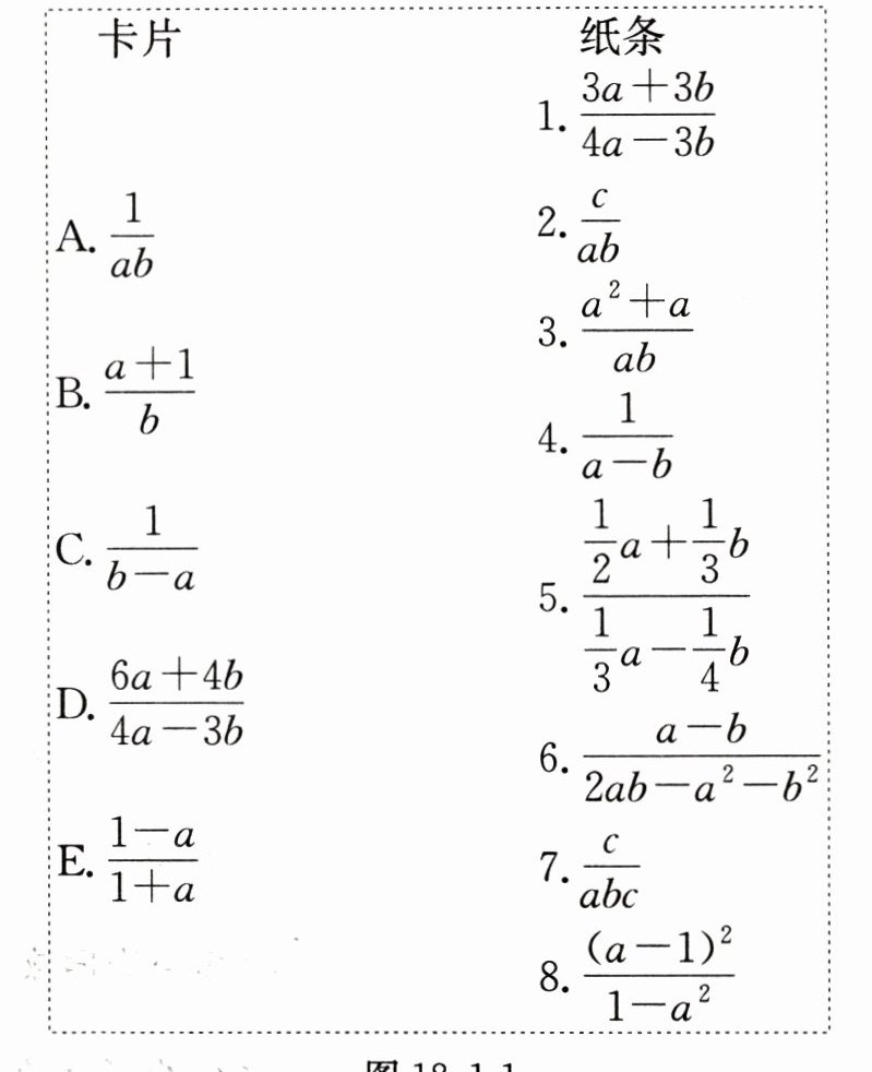 例2 在一次数学活动课上,数学老师在黑板上贴了A,B,C,D,E五张卡片,每张卡片写有一个分式,再随机给8名同学各发一张纸条,每张纸条上也写有一个分式,如图18.1 - 1