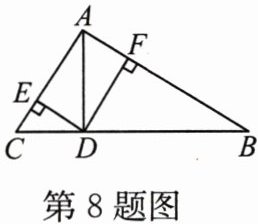 8. 如图,在$Rt\triangle ABC$中,$AC\neq AB$,$AD$是斜边上的高,$DE\perp AB$,$DF\perp AB$,垂足分别为点$E$,$F$,则图中与$\angle C$相等的角的个数是(