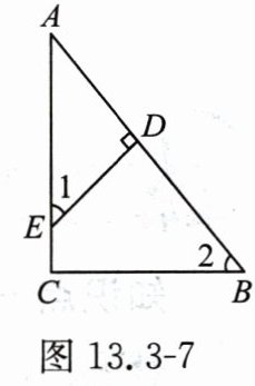 2. 如图13.3-7,$E是\triangle ABC中AC$边上的一点,过$E作ED\perp AB$,垂足为$D$.若$\angle 1= \angle 2$,则$\triangle ABC$是直角三角形吗?为什么?
