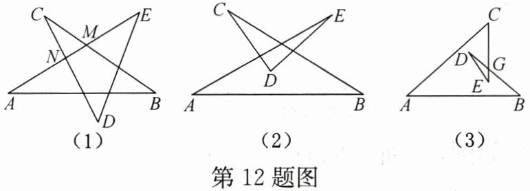 12. 如图,试分别求各图中$\angle A + \angle B + \angle C + \angle D + \angle E$的度数.