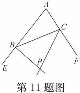 11. 如图,在$\triangle ABC$中,$\angle ABC$,$\angle ACB的外角平分线相交于点P$. (1)若$\angle A = 50^{\circ}$,求$\angle BPC$的度数;(2)若$\angle A = \alpha$,试用含$\alpha的代数式表示\angle BPC$的度数.