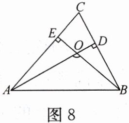 例 3 如图 8,在 $\triangle ABC$ 中,$O$ 是高 $AD$,$BE$ 的交点。若 $\angle C = 75^{\circ}$,则 $\angle AOB= $