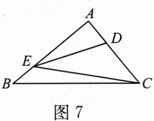 例 2 如图 7 所示,$D$ 为 $\triangle ABC$ 中 $AC$ 边上一点,$AD = 1$,$DC = 2$,$AB = 4$,$E$ 是 $AB$ 边上一点,且 $\triangle ABC$ 的面积等于 $\triangle DEC$ 面积的 $2$ 倍,则 $BE$ 的长为(