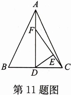 11. 如图,$ \triangle ABC $ 的面积是 $ 1 $,$ AD $ 是 $ \triangle ABC $ 的中线,$ AF = \frac{1}{2}FD $,$ CE = \frac{1}{2}EF $,则 $ \triangle DEF $ 的面积为 ______。