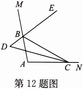 12. 如图,$ \angle A = 100^{\circ} $,$ B $,$ C $ 是射线 $ AM $,$ AN $ 上的动点,$ \angle ACB $ 的平分线和 $ \angle MBC $ 的平分线所在的直线相交于点 $ D $,则 $ \angle D $ 的度数为