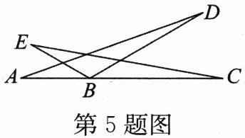 5. 如图,$\triangle ABD\cong\triangle EBC$, $A$,$B$,$C$三点在同一条直线上。若$\angle A = 20^{\circ}$, $\angle ABE = 30^{\circ}$,则$\angle D = $