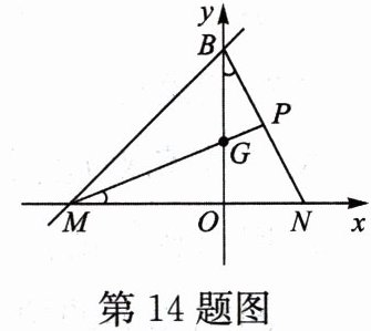 14. 如图,点 $M$,$N$,$B$,$G$都在坐标轴上,将$\triangle MOG$绕 $O$点顺时针旋转 $90^{\circ}正好与\triangle BON$重合。