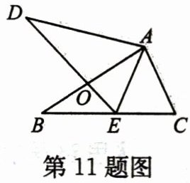 11. 如图,在△ABC和△ADE中,AB= AD,AC= AE,BC= DE. 点E在BC边上,AB交DE于点O.