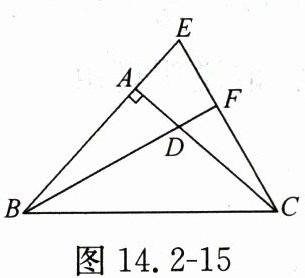 例2 如图14.2-15,$\angle BAC = 90^{\circ}$,$AB = AC$,点$D在AC$上,点$E在BA$的延长线上,$BD = CE$,$BD的延长线交CE于点F$,求证:$BF\perp CE$。