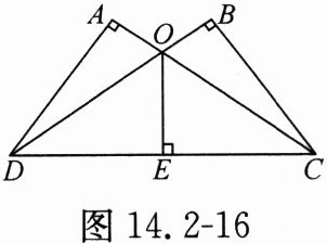 例3 如图14.2-16,$AC\perp AD$,$BC\perp BD$,$OE\perp CD$,$AC = BD$,求证:$DE = CE$。