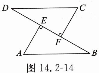 例1 如图14.2-14,已知$AB = CD$,$AE\perp BD$,$CF\perp BD$,垂足分别为$E$,$F$,$BF = DE$。求证:$AB// CD$。