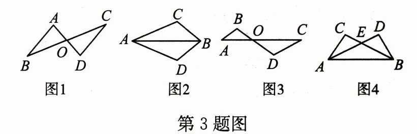 ③如图 3,∠A = ∠C,∠B = ∠D,则△ABO ≌ △CDO
