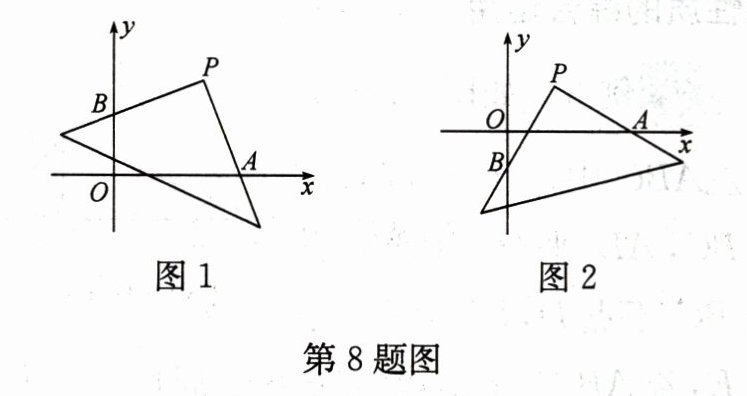 8. 如图 1 所示,在平面直角坐标系中,将直角三角形的顶点放在点 P(4,4)处,两直角边与坐标轴交于点 A 和点 B。