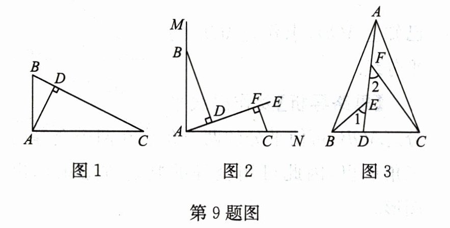 9. 【问题情境】如图 1,在 Rt△ABC 中,∠BAC = 90°,AD ⊥ BC 于点 D,可知:∠BAD = ∠C(不需要证明)。