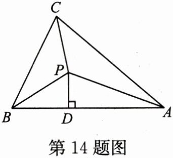 14. 如图,在$\triangle ABC$中,$AP平分\angle BAC$,$CP平分\angle ACB$,作$PD\perp AB于点D$,连接$BP$。
