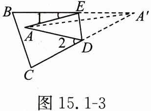 例 3 如图 15.1 - 3,把三角形纸片 ABC 沿 DE 折叠,点 A 落在四边形 BCDE 的内部,则$ \angle 1 , \angle 2 $之间有一种数量关系始终保持不变,请试着找一找这个规律. 你发现的规律是(