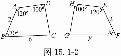 例 2 如图 15.1 - 2,这两个四边形关于某直线对称,根据图形提供的条件求 $ x $,$ y $.
