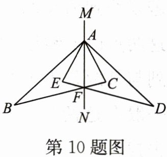 10. 如图,$ \triangle ABC $ 与 $ \triangle ADE $ 关于直线 $ MN $ 对称,$ BC $ 与 $ DE $ 的交点 $ F $ 在直线 $ MN $ 上. 若 $ ED = 8 $,$ FC = 2 $,$ \angle BAC = 75^\circ $,$ \angle EAC = 56^\circ $.