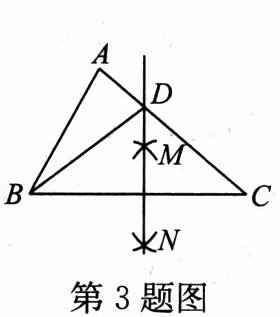 3. 如图,在△ABC中,∠C= 40°,分别以点B和点C为圆心,大于$\frac{1}{2}BC$的长为半径画弧,两弧相交于M,N两点,作直线MN,交边AC于点D,连接BD,则∠ADB的度数为(