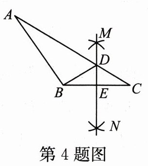 4. 如图,在△ABC中,分别以点B和点C为圆心,大于$\frac{1}{2}BC$的长为半径画弧,两弧相交于点M,N。作直线MN,交AC于点D,交BC于点E,连接BD。若AB= 7,AC= 12,BC= 6,则△ABD的周长为(