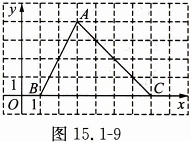 如图15.1 - 9,△ABC的顶点均在格点上,已知A(3,4),B(1,0),C(7,0),利用网格线在图中找一点P,使得PA= PB= PC,则点P的坐标为