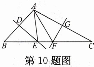 10. 如图,在△ABC中,∠BAC= 120°,若DE,FG分别垂直平分AB,AC,△AEF的周长为10cm。求∠EAF的度数及BC的长。