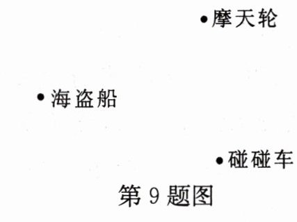 9. 如图,某公园有海盗船、摩天轮、碰碰车三个娱乐项目,现要在公园内建一个售票中心,使得三个娱乐项目所处位置到售票中心的距离相等,请在图中确定售票中心的位置。