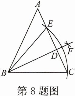 8. 如图,△ABC中,AB= AC,以点B为圆心,BC的长为半径画弧交AC于点C,E,再分别以点C与点E为圆心,大于$\frac{1}{2}$CE长为半径画弧,两弧交于点F,连接BF交AC于点D.若∠A= 50°,则∠CBD= (