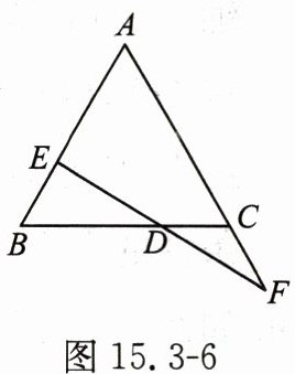 例2 如图15.3-6,在△ABC中,AB= AC,E为AB上一点,F为AC延长线上一点,且BE= CF,EF交BC于点D. 求证:DE= DF.
