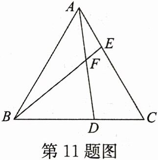 11. 如图,△ABC为等边三角形,点D,E分别在边BC,AC上,且AE = CD,AD与BE相交于点F。