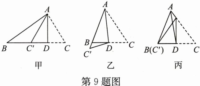 9. 如图,将△ABC沿AD折叠,点C落在点$C'$处,给出下列说法:①甲折出的AD是BC边上的高;②乙折出的AD是△ABC的角平分线;③丙折出的AD是BC边上的中线;④丙折出的AD是△ABC的角平分线。其中正确的有(
