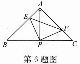 6. 如图,在 $ \triangle ABC $ 中,$ AB = AC $,$ \angle BAC = 90^{\circ} $,$ \angle EPF $ 的顶点 $ P $ 是 $ BC $ 的中点,两边 $ PE $,$ PF $ 分别交 $ AB $,$ AC $ 于点 $ E $,$ F $,且 $ \angle EPF = 90^{\circ} $,连接 $ AP $. 当 $ \angle EPF $ 绕顶点 $ P $ 旋转时(点 $ E $ 不与点 $ A $,$ B $ 重合),给出下列结论:① $ AE = CF $;② $ BE = AF $;③ $ 2S_{四边形AEPF} = S_{\triangle ABC} $;④ $ BE + CF = EF $. 其中正确的有(
