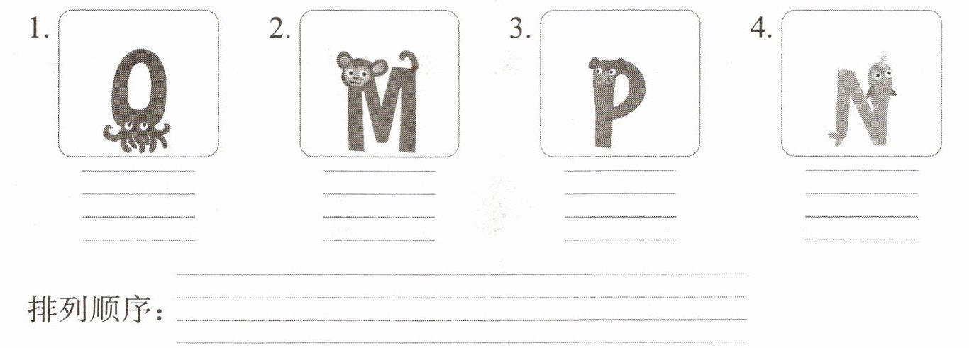 Ⅲ. 根据图片提示,写出相应字母的大小写,再按字母表顺序抄一遍。