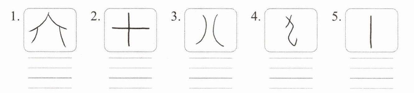 Ⅲ. 下图是汉字“六、七、八、九、十”依次对应的甲骨文。在四线三格里规范地书写其英文单词。