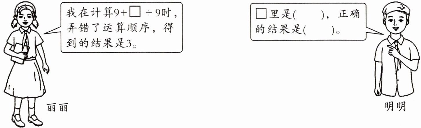 丽丽:我在计算 $9 + □ ÷ 9$ 时,弄错了运算顺序,得到的结果是3。