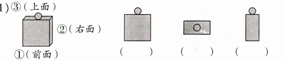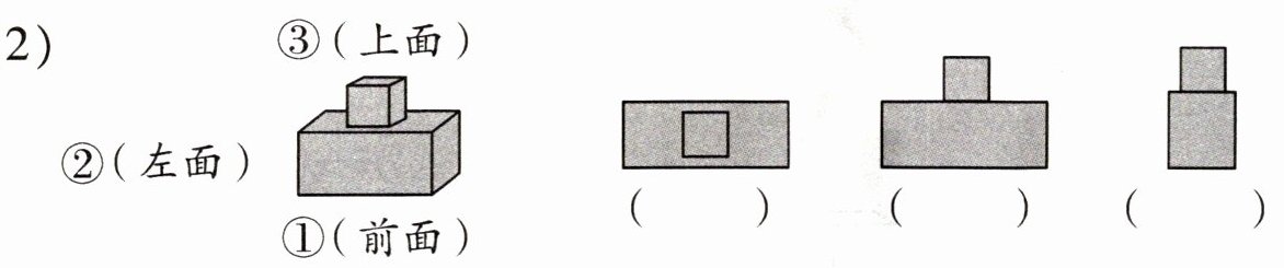 2. 观察下面左图,判断右边的三幅图分别是从哪个位置看到的,把相应的序号填在( )里。
