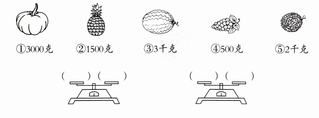 (解析:先统一单位,3000克=3千克,所以①和③重量相等,可放在第一个天平两端;第二个天平需使两边重量相等,1500克+500克+2000克=4000克,题目中没有4000克的物品,正确应为2千克=2000克,1500克+500克=2000克,即②+④=⑤,所以第二个天平一边放②和④,另一边放⑤。)